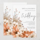 Fleurs d'automne modernes Code QR de mariage en écriture. Ajoutez votre code QR sur le site web de votre mariage au verso, cela en fait une option pratique pour que vos invités répondent et voient tous les détails sans avoir besoin de cartes de réponse et de détails séparées. Un ensemble de texte manuscrit pour le mariage et le reste du texte que vous pouvez facilement personnaliser. Des fleurs de couleur automnale en terre cuite, marron et crème descendent le long du côté gauche et traversent le bas et sont également au verso.