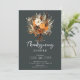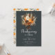 Cette invitation à dîner moderne et rustique Thanksgiving présente un beau bouquet de fleurs d'automne sur un arrière - plan vert foncé. L'invitation est simple et élégante, avec la date, l'heure et l'emplacement du dîner dans une police de caractères de bon goût. Le design général est parfait pour célébrer les vacances Thanksgiving avec vos proches.