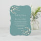 Une illustration originale de magnifiques fleurs de cerisier blanches à la crème d'ivoire ou fleurs de printemps sakura avec des branches brun clair sur un fond vert turquoise sarcelle. Il s'agit d'une invitation de mariage moderne recto-verso pour le jour du mariage / carte de réception de dîner de mariage.