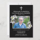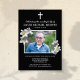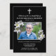 Rendez l'hommage à la mémoire d'un être cher simple et spécial avec notre invitation de souvenir de funérailles. Ce design élégant présente un fond noir sophistiqué, une section pour une photo chérie, une croix solennelle et de superbes fleurs de lys blanches détaillées. Notre modèle de célébration de la vie facile à personnaliser rend chaque détail encore plus sincère et unique.