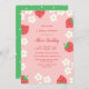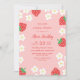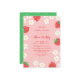 Cute invitation baby shower en rose avec fraises et fraises. Le dos est vert parsemé de minuscules confettis blancs.