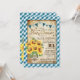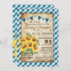 Un design inspiré du pique-nique de campagne avec chèque en vichy bleu et bouquet de tournesol dans un bocal de mason enveloppé dans un burlap et de la dentelle et attaché avec une carte d'invitation de baby shower rustique à ficelle.