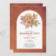 Fleurs en terre cuite et citrouille à l'invitation de la fête de fiançailles. Ce joli design mariage dispose d'un cadre en arc sur arrière - plan taché de terre cuite. Dans le cadre il y a un bouquet de fleurs en terre cuite et un citrouille.