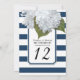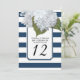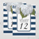 Numéros de table pour votre douche de mariée, fête d'anniversaire, réception de mariage ou autre événement formel. Les hydrangeas blanches peintes à la main sont associées à un motif rayé moderne et large en bleu marine et blanc avec un contour de paillettes d'argent minuscules. Un cadre à angle encoché inspiré de l'art déco termine le design. copyright, Audrey Jeanne Roberts.