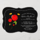 Illustration fantaisiste avec plusieurs fleurs rouges avec de grands coeurs attachés à une tige verte. 2 papillons jaunes planent à proximité. Placez-vous sur un arrière - plan noir. Personnalisez l'invitation pour le brunch de cette mère avec vos propres détails de fête.