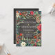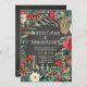 Faire-part de mariage moderne de style rustique avec de belles fleurs rouges et blanches d'aquarelle, des baies et des cônes de pin avec feuillage sur un arrière - plan de tableau noir gris foncé. ++++++++++++++++++ Convient pour l'hiver rustique de campagne ou de montagne station balnéaire / gîte / mariages de ferme
