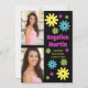 Invitation rétro amusante à la fête de graduation de style hippie avec des fleurs colorées rose, turquoise, vert et jaune sur un arrière - plan noir avec 2 de vos photos préférées. Cette carte est conçue à la fois à l'avant et à l'arrière. Le recto de la carte contient vos photos, le nom du diplômé, le nom de l'école, l'année de remise des diplômes, et le verso contient vos informations sur la fête.