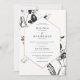 Un faire-part de mariage floral sophistiqué et exquis avec un arrière - plan de belles et délicates fleurs noires et blanches, accentué par un cadre géométrique doré (imprimé) présentant vos détails de cérémonie mariages en polices serif gris foncé pour un style romantique mais moderne.
