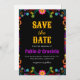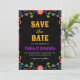 Célébrez votre amour avec cette carte de date élégante et festive ! Dotée d'une belle décoration florale inspirée du traditionnel picado papel mexicain, cette carte est parfaite pour un mariage de destination ou une fête sur le thème de la fiesta. L'arrière - plan noire crée un style sophistiqué et moderne, tandis que les couleurs vives et les détails complexes ajoutent une touche de charme traditionnel.