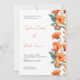 Voici une belle faire-part de mariage qui saura capter l'attention de vos invités. Cette élégante invitation présente une enfilade de magnifiques fleurs oranges et de verdure qui encadrent le côté droit de l'invitation, ajoutant une touche de nature et de chaleur au design. Le reste du texte est présenté dans une simple police noire, les noms des couples se distinguant par une police de caractères oranges élaborée et moderne. Ce faire-part de mariage blanc conviendra parfaitement aux couples qui souhaitent un mariage au printemps ou à l'automne, ou à ceux qui ont choisi l'orange ou le vert comme principal coloris mariage. L'arrière - plan blanche, vive et immaculée, offre une atmosphère classique et intemporelle à l'invitation, tandis que le design floral orange et vert et vibrant ajoute une touche de couleur et une touche de fantaisie. Avec son design unique et élégant, ce faire-part de mariage est parfait pour les couples qui veulent faire une déclaration avec leur papeterie mariage. La combinaison de l'élégante police noire, de la police de script orange joueuse et du design floral plein de charme crée un beau look cohésif qui ne manquera pas d'impressionner. Vos invités seront ravis de recevoir une telle invitation et compteront jusqu'à votre jour spécial. Dans l'ensemble, cette belle faire-part de mariage est un choix merveilleux pour les couples qui recherchent un design à la fois élégant et ludique. Parfait pour ceux qui veulent mettre en valeur leur amour de la nature et incorporer une touche de couleur à leur thème mariage.
