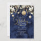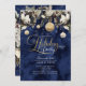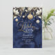 Partagez un peu d'émerveillement de Noël avec ces magnifiques invitations à la fête des Fêtes! Ces invitations sont imprimés de boules d'or et de blanc sous un amas de fleurs d'ivoire et de branches de sapin sur une toile de fond bleu marine remplie de délicats flocons de neige et d'étoiles d'argent. Le fond est assorti à un arrangement floral. Une fois que vos invités ouvriront ces invitations, ils sentiront l'esprit de la saison !