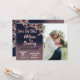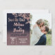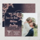 Élégant, chic et simple, moderne avec faux imprimé or rose pailleté, fleurs et typographie sur fond bleu marine à la mode, carte de save-the-date de mariage. Ce design classique et sophistiqué est parfait pour le couple tendance et élégant qui se marie. Personnalisez avec votre propre message au recto ainsi qu'un monogramme personnalisé au verso. Conception entièrement réalisée en impression photo.