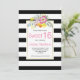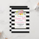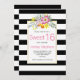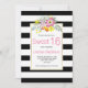 Belle invitation d'anniversaire au Sweet sixteen moderne et chic présentant de jolies fleurs roses, une bordure en rayures noires et blanches et votre texte sur un cadre blanc. Le dos est recouvert d'une motif rayée en noir et blanc.