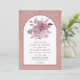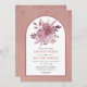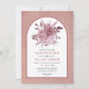 Cette faire-part de mariage pour une fête estivale présente une charmante arche encadrée sur un fond de rose rose poussiéreux et taché. Le design est agrémenté de belles fleurs dahlia et roses, accompagnées de feuillage et d'herbe pampas dans des tons variés de rose rose poussiéreux.
