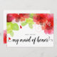 Fleurs rouges éthérées et écriture cursive style calligraphie manuscrite mariage printanier fleuri "Serez-vous ma servante d'honneur?" carte. Cette belle décoration présente des fleurs rouges et roses avec des feuilles verts.