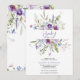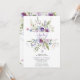 Cette invitation à une baby shower tendance présente des fleurs sauvages aquarelles bleu clair et violet, rose pâle, ainsi que des feuilles et des branches verdoyantes.