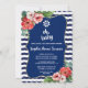 Elégant, exotique, conception de carte de destination avec Luau Hawaiian Flowers Bouquets, bandes bleu marine comme des vagues, une barre blanche, une forme bleu marine avec cadre faux or pour l'information, charmant écriture manuscrite oh, typographie bébé. Pour les articles correspondants, s'il vous plaît, visitez ma collection de Mariages Tropical Floral Luau Navy Blue Stripes.