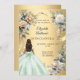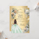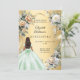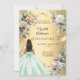 Un arrière - plan à l'allure d'or. Décoré de fleurs blanches et jaunes, vert sauge, ruban doré. Une fille portant une tiare et une robe verte. Personnalisez et ajoutez un nom et des détails.