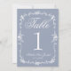 Classy and elegant botanical floral white and dusty blue wedding table numbers. As you see it features a blue old money background with white script that match the whole suite. And white outline floral frame.