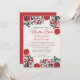 This Floral Elegant Colorful Fiesta Spanish Wedding Invitation design features bold, vibrant floral illustrations in rich reds, blues, and pinks, inspired by traditional Mexican folk art. The floral motifs are arranged symmetrically in the top and bottom corners, framing the blank center space perfectly for text. The subtle textured background adds depth and warmth, making it ideal for wedding invitations or festive stationery with a colorful, cultural flair.