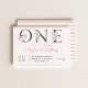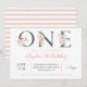 Jolie aquarelle rose et verdure délicate ornée de lettres de caractère audacieuses, invitation 1er anniversaire. Cute et girly floral "ONE" avec design typographique tendance. Le dos de la carte comporte la coordination motif à bande d'aquarelle rose.