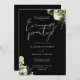 Cette élégante invitation à la soirée mariage fleurie en noir et blanc, avec de jolies lampes à cordes et une verdure fleurie, peut être personnalisée avec vos informations en typographie chic avec les détails de votre site web mariage et votre code QR au verso. Conçu par Thisisnotme©