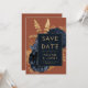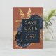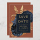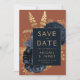 Cette élégante carte Save the Date présente un bouquet floral luxuriant et romantique en bleu marine avec fausse feuille d'or et feuillage de parties scintillant sur un arrière - plan rouille ou orange brûlé. Customisez le texte de couleur or dans des polices stylisées sur un rectangle bleu marine, et ajoutez l'URL de votre site Web mariage à l'orange gravé solide.