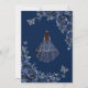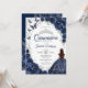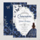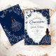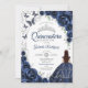 Navy silver and white floral Quinceanera celebration invitation. Features brunette girl in ball gown dress, script font, silver butterflies, watercolor roses and tiara. Perfect for an elegant princess style glam celebration. Personalize with your own details. Printed Zazzle invitations or instant download digital printable template.