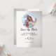 Une invitation simple et moderne avec un tableau dans une couronne de fleurs turquoise. L'arrière - plan est en dégradé blanc et gris