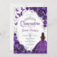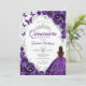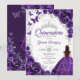 Purple silver and white floral Quinceanera celebration invitation. Features brunette girl in ball gown dress, script font, silver butterflies, watercolor roses and tiara. Perfect for an elegant princess style glam celebration. Personalize with your own details. Printed Zazzle invitations or instant download digital printable template.