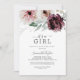 Cette romance florale c'est une invitation baby shower fille est parfait pour un baby shower élégant. Le design boho rustique moderne présente des fleurs d'aquarelle romantiques dans des tons doux de bordeaux, mauve, rose rousse et blanc crème avec des feuilles verts.