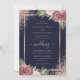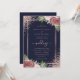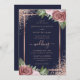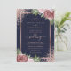Complétez votre mariage bleu marine et or rose avec ces élégantes invitations à mariage florales avec un cadre en or rose orné de roses roses roses et de parties scintillant/confettis en or rose.