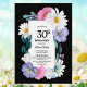 Invitation à la fête du 30e anniversaire aux rideaux noirs et vibrants, avec fleurs roses et violettes, marguerites blanches et verdure entourant le texte.