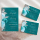Le bord gauche de cette élégante faire-part de mariage moderne en forme d'arc présente un bouquet floral aux tons turquoise et bleu clair, paré de fausse feuille argent et de faux feuillage de parties scintillant et parsemé de fausse parties scintillant argent. Le texte personnalisable combine écriture manuscrite gris argenté pâle, copperplate et italique sur un arrière - plan turquoise. L'envers est turquoise et solide.