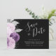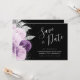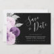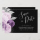 Cette élégante carte moderne de sauvegarde du jour présente un bouquet floral dans les tons violet et lavande, paré de fausse feuille argent et de faux feuillage de parties scintillant et parsemé de fausse parties scintillant argent. Le texte personnalisable combine écriture manuscrite gris argenté pâle, copperplate et italique sur un arrière - plan noir. L'envers affiche un design floral assorti.