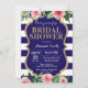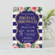 Invitation à la douche nuptiale bleu et or de la Marine. Fleur florale rose aquarelle. Parties scintillant d'or. Flore rose. Navy Blue and White Stripes.