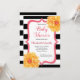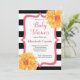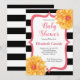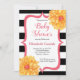 Belles fleurs jaunes, rayures noires et blanches et invitation rose de baby shower pour une future mère.
