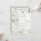 Ces invitations de mariage de 5" x 7" présentent un motif abstrait en feuilles dans les tons de sauge poussiéreux et de kaki avec des substituants, "Nous vous invitations à célébrer le mariage de", les prénoms et prénoms de mariée et mariée, date, heure, nom et adresse du mariage, "réception à suivre".