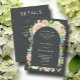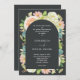 Toutes les invitations de mariage en une seule présentent les détails de votre cérémonie sur le devant et plus de détails sur le dos en lettres blanches chic. Belles fleurs d'aquarelle - hydrangées blanches et vertes, roses roses et crème, marguerites, petites tiges et feuilles - sur le devant avec vos infos sur une couverture voûtée foncée. CORRESPONDRE des articles dans notre magasin.