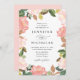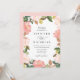 Élégantes invitations de mariage florales avec vos détails mariages encadrés par des roses d'aquarelle rose vif et des tulipes avec des feuilles verts luxuriants et en cuivre. Les invitations à un mariage floral se retournent vers un arrière - plan rose pâle. Conçu pour coordonner avec notre collection de mariages florale de printemps de Blush.