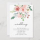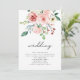 Floraux de Peach rose moderne Script Wedding Invite. Ajoutez votre code QR à votre site Web mariage au dos fait de cette option pratique pour vos invités à RSVP et voir tous les détails sans avoir besoin de RSVP séparé et de cartes de détails. Un élégant style de set informel pour l'en-tête avec tous les détails élégamment petit sous et Aquarelle bleu et flancs de pêche bordant le haut. Personnalisez facilement vos informations.
