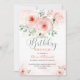 C'est une invitation féminine et belle d'anniversaire avec des roses roses roses et des feuilles verts.