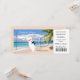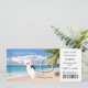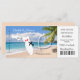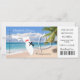 Un faire-part de mariage amusant mais élégant dans un style carte d'embarquement / billet pour les couples se mariant à l'étranger en Floride qui est montré dans une silhouette carte sur une scène générique de plage et palmiers, avec coeur doux, silhouette d'avion et forme de coeur tourbillonnant L'inverse a un espace pour votre photo et contact / détails RSVP