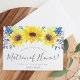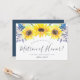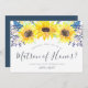 La carte de proposition de fête de mariage florale rustique comporte une bordure supérieure de tournesol jaune aquarelle et de bourgeons fleurs sauvages bleu marine. Personnalisez avec vos détails de demande de remise de matron d'honneur (avec "serez-vous mon matron d'honneur? Je ne peux pas dire que je le fais sans vous") dans un texte moderne écrit à la main et des lettres serif traditionnelles. Les invitations se retournent vers le bleu du port riche.