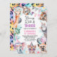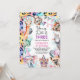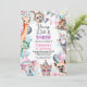 Colorful safari themed young, wild and three birthday invitation for girl featuring various jungle animals, bunting flag, balloons, party hats and foliage. All text is editable making the template suitable for any age.