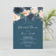 Cette invitation à dîner en bleu de fleurs rousses et marines est parfaite pour une répétition mariage florale. Le design classique et élégant présente une aquarelle moderne bleu marine et des fleurs roses rousses sur un arrière - plan bleu turquoise.