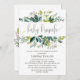 Cette carte d'invitation au brunch pour bébés feuillage est parfaite pour un baby shower de brunch rustique. L'aménagement comprend un cadre boho composé de feuilles verts et de plantes botaniques verdoyantes. L'appui est assorti d'une couronne de pays qui peut être personnalisée avec le nom de la future mère.