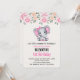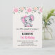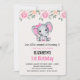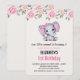 Une invitation à une fête d'anniversaire avec une illustration aquarelle d'un éléphant rose mignon. Elle a des oreilles à pois roses et blancs adorables et un joli nœud ruban rose sur le dessus de sa tête. Le dessus est décoré d'un beau bouquet de roses.