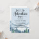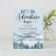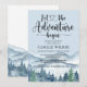 Laissez l'aventure commencer par thème bleu aquarelle invitation baby shower avec forêt et montagnes paysage sauvage avec calligraphie script typographie avec coeur au milieu. Voir la collection complète de produits pour cette conception à l'adresse suivante : https://www.zazzle.com/collections/forest_adventure_baby_shower-119311648144421112