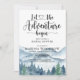 Une aventure de forêt d'aquarelle à feuillage persistant invitation à la douche nuptiale avec une aventure commence thème. Typographie de script de calligraphie.